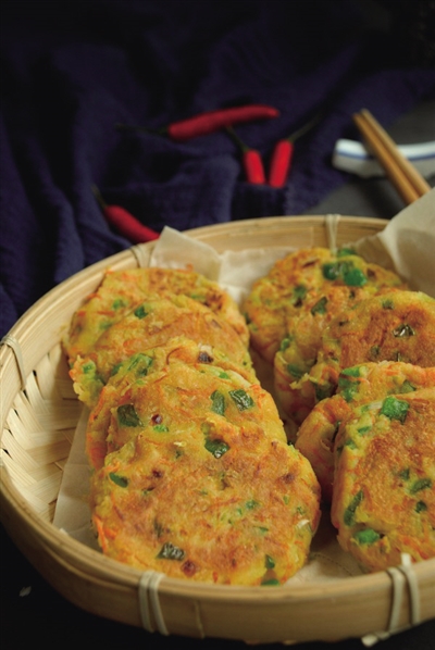 做法:1.红萝卜洗净擦成丝,青椒切碎,葱花备好;2.准备小苏打和泡打粉,只有1克的量,用食指和拇指捏一撮就好;3.红萝卜丝和青椒碎、豆渣放入盆内,加入盐,搅拌均匀;4.加入葱花拌匀后,放入玉米面、普通面粉、小苏打、泡打粉,用手抓拌均匀;5.平底锅烧干倒油,用手揉成小饼放入锅内小火慢慢煎至两面金黄即可。