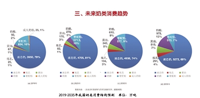 那么未来乳品市场有多大,发展趋势如何?对此,农业农村部食物与营养发展研究所动物中心负责人、中国奶业协会乳品营养与消费专委会副主任副主任程广燕提供了中国奶业协会营养与消费专业委员会的研究数据,提出了未来奶类消费趋势预测和分析,即到2025年,我国人均奶类消费量可达40.88公斤,消费总量5825万吨;到2035年,我国人均奶类消费量53.90公斤,消费总量7650万吨。