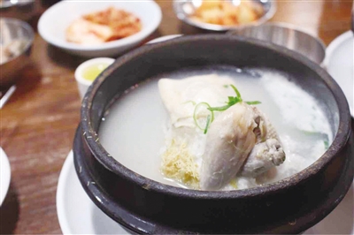 这是一家韩国料理店,很多人秋冬会来这儿喝汤。传统参鸡汤是店里推荐菜,简单的鸡汤和淡淡的人参味道,喝着很舒服,身体也没有负担。汤里的童子鸡,一个人吃正好,口感很嫩,搭配的蘸料很提味;鸡肚子里的糯米混合着汤,非常鲜美,入口稍黏稠,香气四溢。