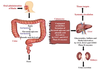 本综述详细阐述了芦丁的主要天然来源,药代动力学和生物利用度(图2),及其抗癌作用及相关的分子机制。芦丁不易被吸收到血液中,因为它的糖部分会阻止其通过肠道上皮层。因此,与其他类黄酮糖苷相比,其生物利用度较差。但口服饮食中的芦丁后,它能被哺乳动物肠道菌群代谢并从肠道吸收,并以结合代谢物的形式被生物利用。
