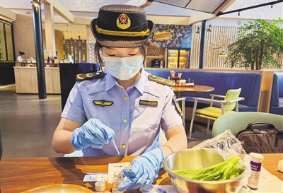 二是强化现场监管,严守安全防线。执法人员对万豪酒店送餐企业资质进行严格审核,要求其严格执行双留样制度,并提醒指导主办方严格把控食品出餐、用餐温度。在雅乐轩酒店,执法人员深入食品加工一线,对食品原料贮存、加工烹饪、餐品留样,以及餐饮用具清洗消毒等全流程实施精准监管,并开展食品安全宣传提示。此外,利用快速检测设备,对餐具洁净度、蔬菜农残、菜品中心温度等项目进行检测,累计完成75件快检任务,合格率达100%,以科技手段为食品安全保驾护航。