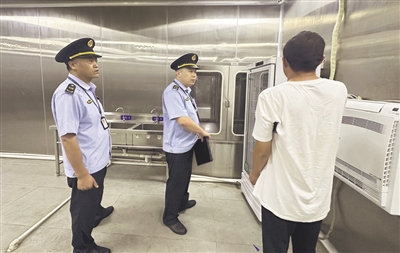 执法人员现场审核“中央厨房+微厨房”模式餐饮企业。