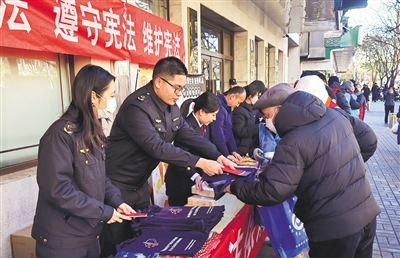 月坛街道市场所开展街头普法,发放《中华人民共和国宪法》《以案释法》《公平竞争审查条例》读本,以案例释法引导群众增强法治观念。