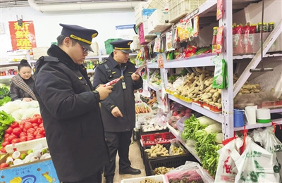执法人员检查农贸市场食品安全。