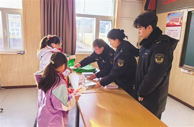 执法人员向学生发放食品安全监管、用药安全、产品质量三类宣传册。