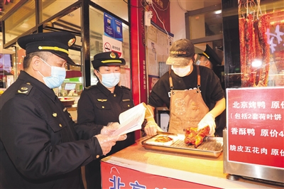 近日,北京市丰台区市场监管局对辖区首航商业综合体开展食品安全专项督查工作。执法人员对综合体内部餐饮店、食品经营店等主体进行突击检查。督查组细致查阅食材进货台账、检测报告,核对“日管控、周排查、月调度”制度落实及上墙公示情况;重点检查食材新鲜度、生熟食品分区存放、后厨“三防”设施配备及使用效果等关键环节。董芳忠 摄